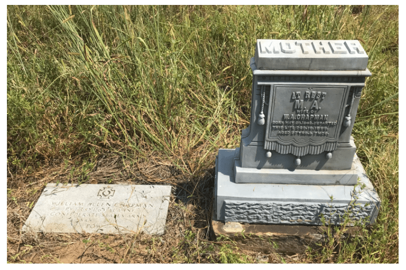 At this late stage in the bloody war between the states, Chapman’s company was populated entirely by teenagers. Mercifully, they were not thrust into battle amid what was clearly a lost cause by that time. According to military records, he and his comrades were held back as a rear guard until the end of the war. It is unclear whether his company was captured, surrendered, or simply held for a time before being processed from CSA forces back to civilian life at the end of the war. Chapman’s detainment drew the distinction of being recognized as a prisoner of war, or POW, and is so noted on his modest U.S. military-issued grave marker.